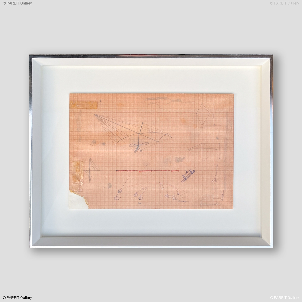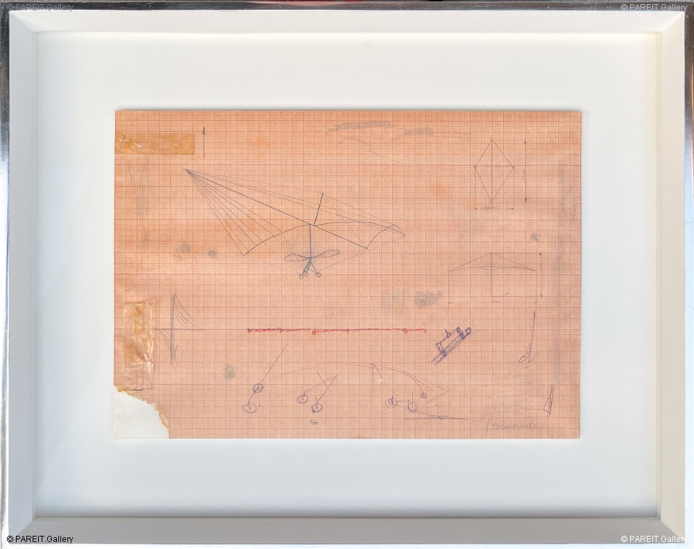 Originele tekening van Panamarenko. Het werk is professioneel ingelijst in een gemetaliseerde kader. Vroege ontwerp tekening van de Delta vliegtuig. Het zweefvliegtuig is uitgerust met een mankracht, pedaal gedreven propeller. Het werk is voorzien van een echtheidscertificaat van de Panamarenko foundation. Inventaris nummer TPD-D-1972-1