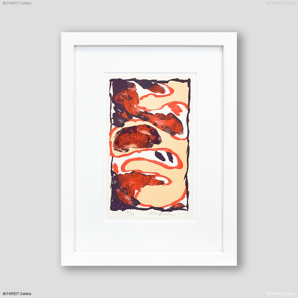 Lithografie van Pierre Alechinsky. Getekend en genummerd op 75 exemplaren. Het werk is ingelijst in ontspiegeld museumglas in een witte lijst.