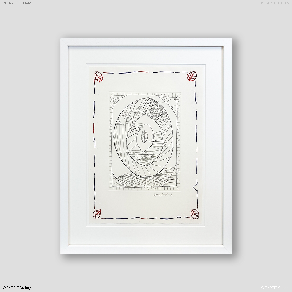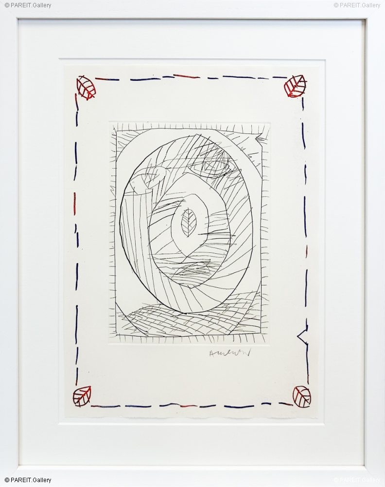 Ets van Pierre Alechinsky. Getekend en genummerd op 75 exemplaren. Het werk is ingelijst in ontspiegeld museumglas in een witte lijst.