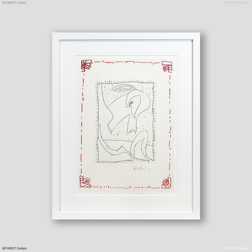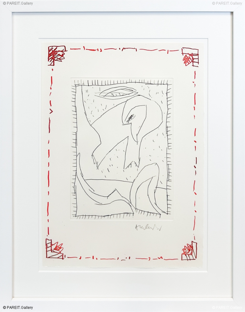 Ets van Pierre Alechinsky. Getekend en genummerd op 75 exemplaren. Het werk is ingelijst in ontspiegeld museumglas in een witte lijst.