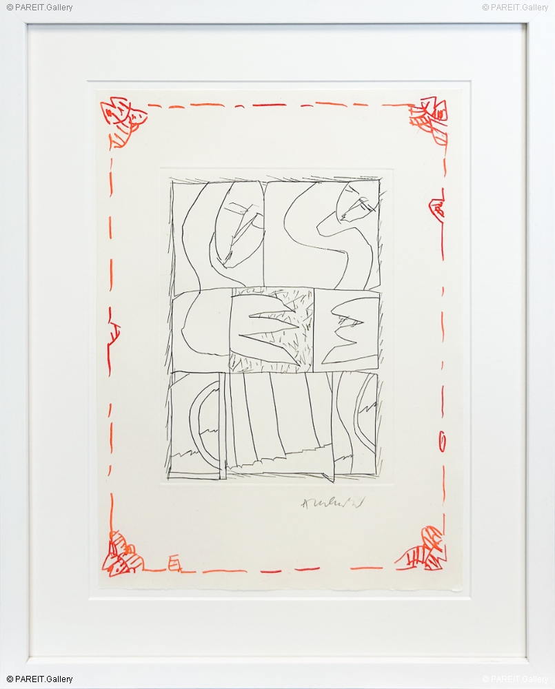 Ets van Pierre Alechinsky. Getekend en genummerd op 75 exemplaren. Het werk is ingelijst in ontspiegeld museumglas in een witte lijst.