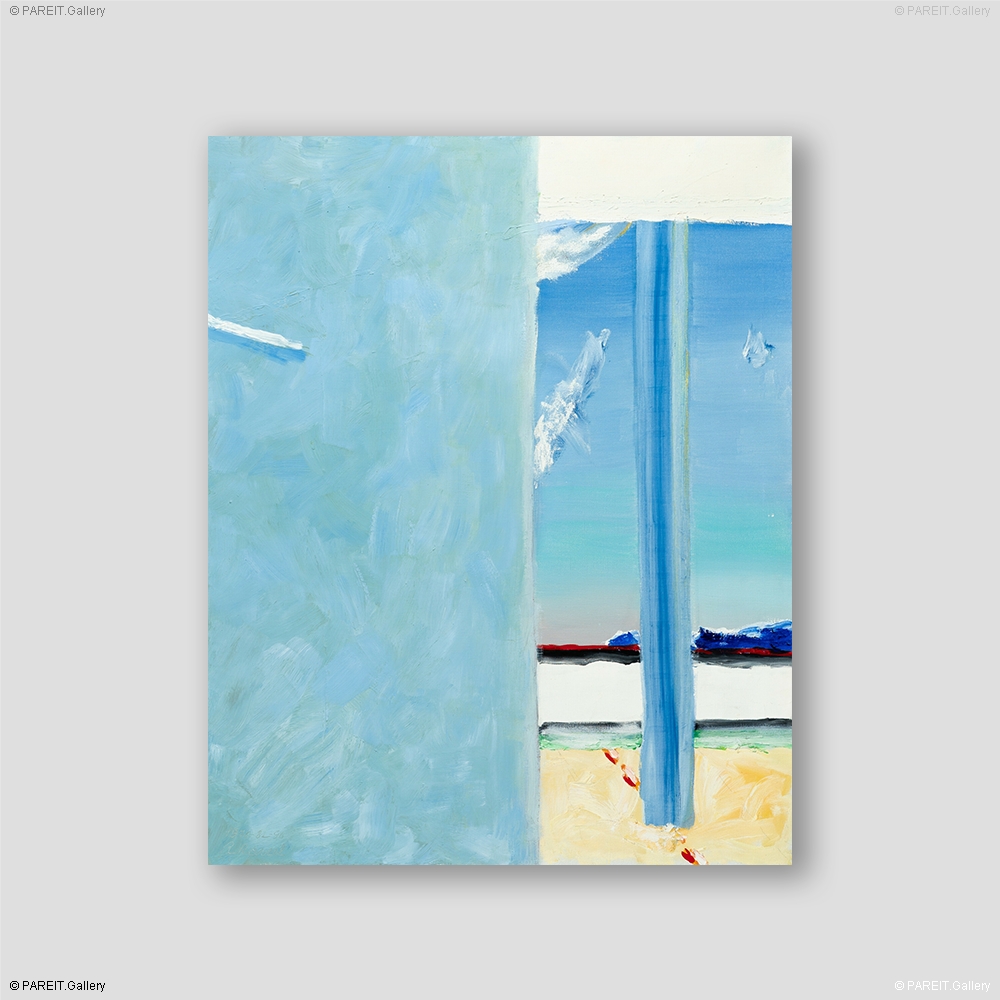 In "De beperktheid van een oneindige verticale" toont Roger Raveel een ronde pilaar die lijkt op te rijzen vanachter een muur. Een helderblauw kleurenpalet met witte "vlekken" domineert het beeldvlak en schept een gevoel van levendigheid, licht en openheid. In de verte is een donkerder blauw zichtbaar, mogelijk een verwijzing naar de zee - een klassiek symbool van oneindigheid. Het werk is, zoals vaak het geval is binnen Raveels contemplatieve oeuvre, open voor verschillende interpretaties. De compositie zou een spanning kunnen suggereren tussen de afgeknotte verticaliteit van de pilaar, die abrupt eindigt tegen een wit blok (plafond), en de ongrijpbare, uitgestrekte horizontale ruimte van de zee. Tevens valt nog een subtiele tegenstelling op tussen de twee rode lijnen in het werk: een wederom ogenschijnlijk afgeknotte verticale en een doorheen het schilderij lopende horizontale, respectievelijk gestreept en vol. Zoals Raveel ooit zei: "Ik wil de werkelijkheid schilderen zoals ze zich aan mij voordoet." Dit werk toont hoe die werkelijkheid zowel begrensd als on(be)grijpbaar kan zijn.
