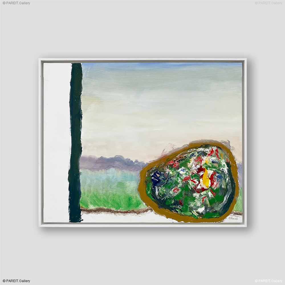 Dit werk behoort tot de late periode van zijn oeuvre, waarin Raveel steeds vaker kiest voor uitgepuurde composities met eenvoudige vormen, ruime witpartijen en een uitgesproken gevoel van verstilling. Het horizonzicht op de achtergrond weerspiegelt deze ingetogen stijl, met een subtiel spel van zachte, lichte kleuren.
