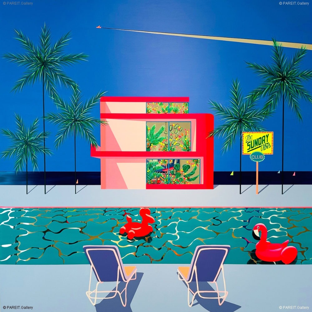 Dit werk maakt deel uit van de reeks Sunshine Pop (2025) en is een origineel acrylschilderij op plexi-spiegel, omlijst door een lichte metalen kader. Zonder te weten waar we zijn of wat er staat te gebeuren, worden we meegenomen naar mysterieuze, kleurrijke plekken. Voor de kunstenaar vormen deze taferelen een levendige herinnering aan diverse reizen en haar persoonlijke Miami-verhaal. Voor de toeschouwer zijn het energieke, positiviteit uitstralende werken, waarin spiegelvlakken en lichtreflecties actief meespelen in de visuele dialoog.