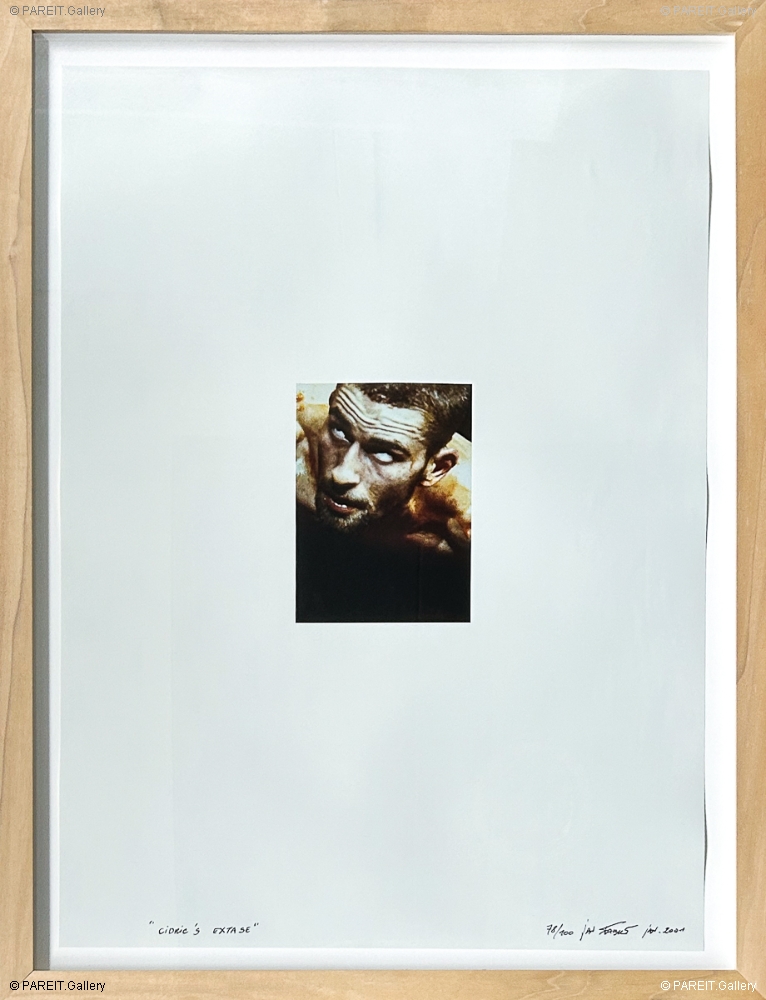 Extra info: Het werk "Cedric's Extase" van Jan Fabre is een C-print (kleurfotoprint) uit 2001, en werd uitgegeven als een genummerde en gesigneerde editie van 100 exemplaren. Het werk maakt deel uit van de portfolio "Red de Mosselpot", uitgegeven door de Vrienden van het S.M.A.K. (Stedelijk Museum voor Actuele Kunst in Gent).