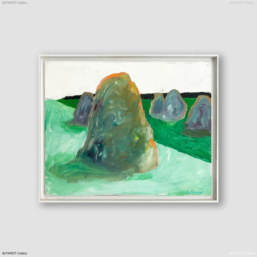 Extra info: Origineel olieverfschilderij op canvas, voorzien van een witte houten baklijst. De "hooioppers" van Roger Raveel zijn een terugkerend motief in zijn oeuvre, vooral in de periode van de jaren 1940 tot 1970. Een hooiopper is een stapel hooi die op het veld wordt gezet nadat het hooi geschud is - een typisch beeld uit het landelijke Vlaanderen van Raveels jeugd. In 2012 werd hiervan een editie gemaakt op 100 exemplaren. Dit is het originele schilderij gebruikt voor de editie.