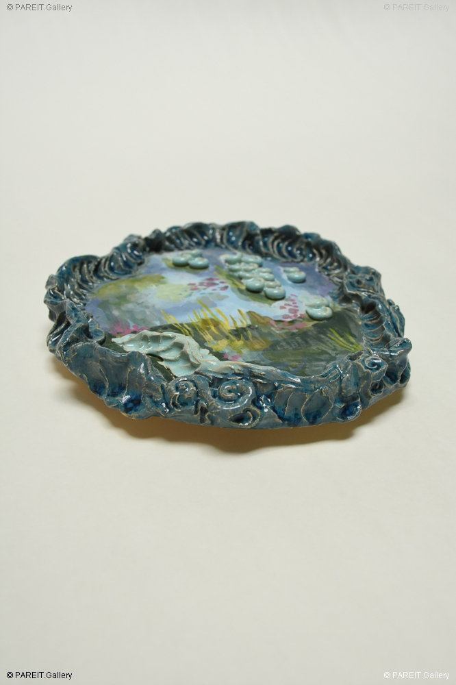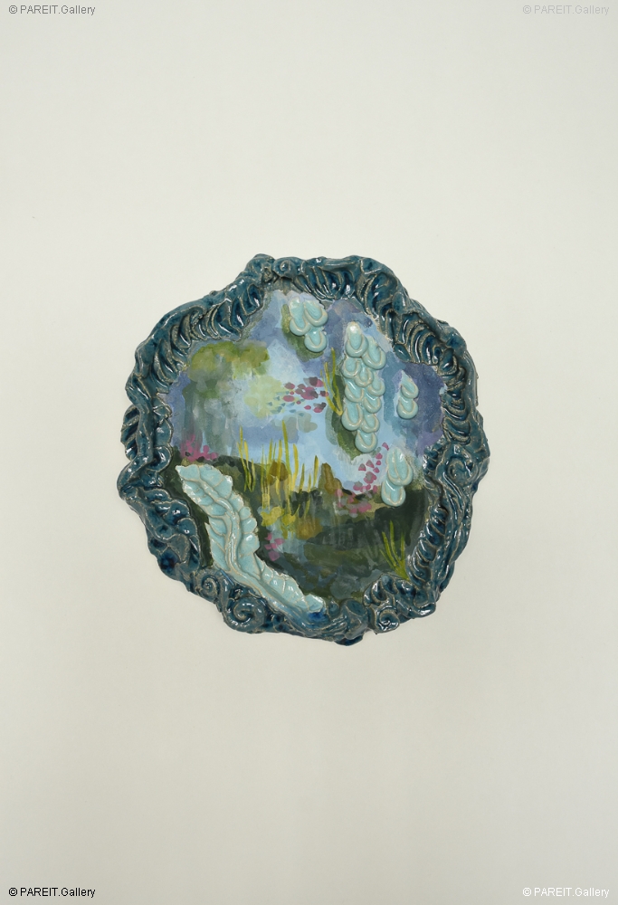 Dit keramische werk, geïnspireerd op persoonlijke herinneringen van de artieste - vaak vage momenten uit lang vervlogen tijden of dromen - combineert verfijnde penseeltoetsen met een poëtische gevoeligheid. De uitzonderlijke excentrieke framing verwijst naar de ornamentale rijkdom van de Rococo, een stijl die schoonheid, speelsheid en detail volledig omarmde. De vloeiende vormen, zachte kleuren en sierlijke patronen creëren een emotionele en expressieve beleving, als visuele poëzie. Sommige elementen zijn tastbaarder dan andere, wat een extra, voelbare laag aan de ervaring toevoegt. Kleine "resting spots" nodigen de kijker uit om iets letterlijk of figuurlijk in het werk te plaatsen, waardoor het kunstwerk transformeert tot een object dat je terugvoert naar de ruimte van herinnering.