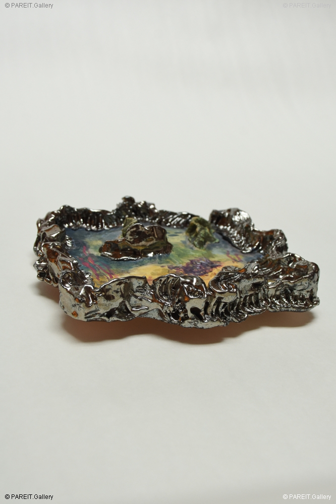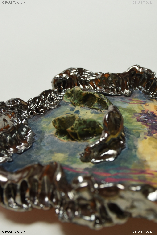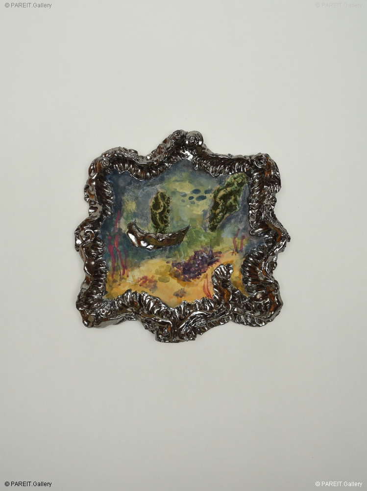 Extra info: Dit keramische werk, geïnspireerd op persoonlijke herinneringen van de artieste - vaak vage momenten uit lang vervlogen tijden of dromen - combineert verfijnde penseeltoetsen met een poëtische gevoeligheid. De uitzonderlijke excentrieke framing verwijst naar de ornamentale rijkdom van de Rococo, een stijl die schoonheid, speelsheid en detail volledig omarmde. De vloeiende vormen, zachte kleuren en sierlijke patronen creëren een emotionele en expressieve beleving, als visuele poëzie. Sommige elementen zijn tastbaarder dan andere, wat een extra, voelbare laag aan de ervaring toevoegt. Kleine "resting spots" nodigen de kijker uit om iets letterlijk of figuurlijk in het werk te plaatsen, waardoor het kunstwerk transformeert tot een object dat je terugvoert naar de ruimte van herinnering.