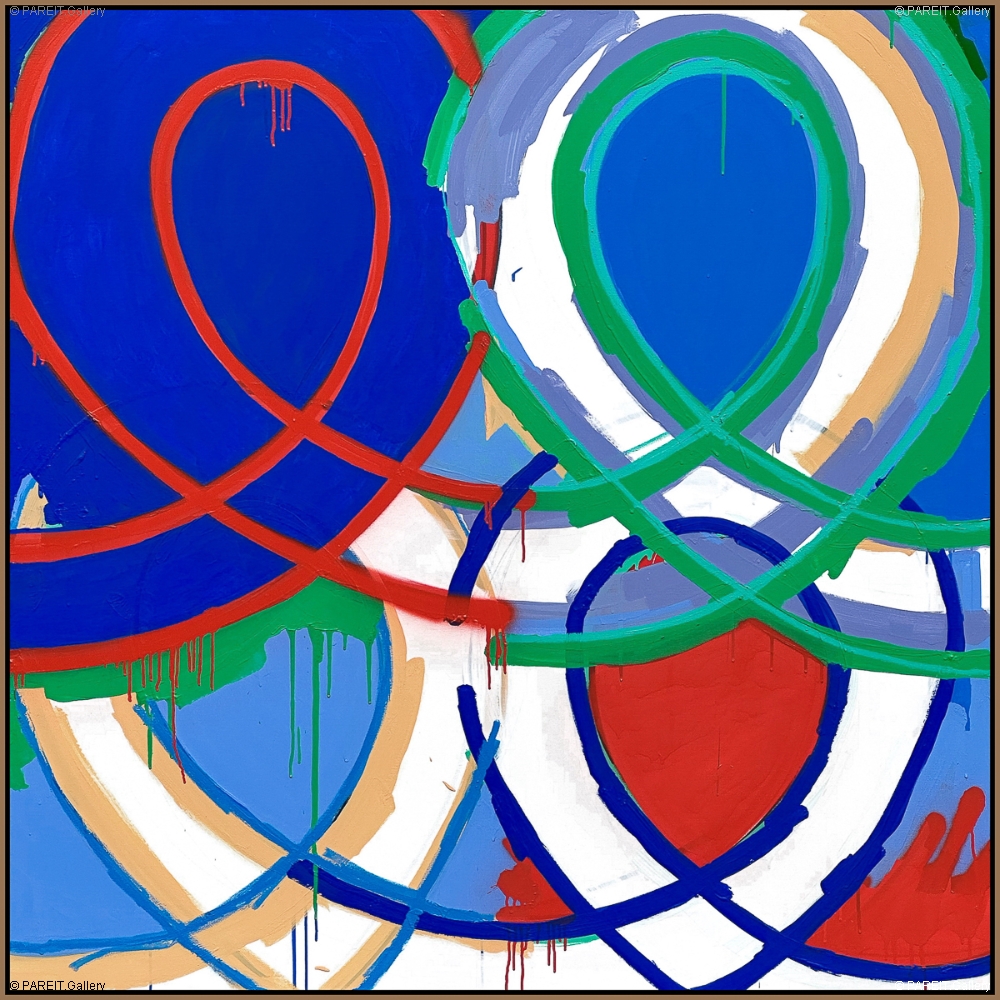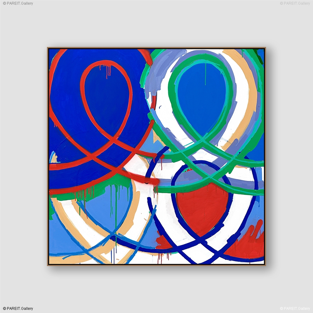Origineel schilderij op canvas van Piroeh One, afgewerkt met een smalle houten lijst en klaar om op te hangen. Het werk toont de kenmerkende "Swoons" van de kunstenaar: kleurrijke ellipsvormige cirkels die emotionele intensiteit en ritme uitstralen. Gesigneerd op de achterkant.