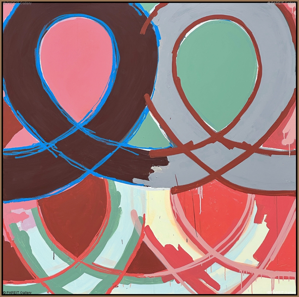 Origineel schilderij op canvas van Piroeh One, afgewerkt met een smalle houten lijst en klaar om op te hangen. Het werk toont de kenmerkende "Swoons" van de kunstenaar: kleurrijke ellipsvormige cirkels die emotionele intensiteit en ritme uitstralen. Gesigneerd op de achterkant.
