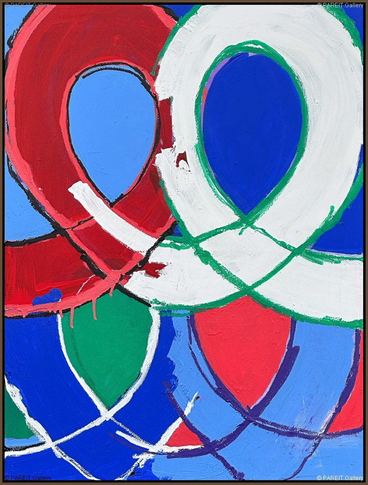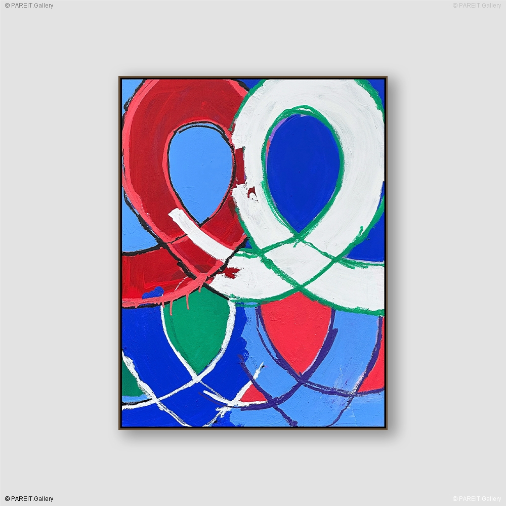 Origineel schilderij op canvas van Piroeh One, afgewerkt met een smalle houten lijst en klaar om op te hangen. Het werk toont de kenmerkende "Swoons" van de kunstenaar: kleurrijke ellipsvormige cirkels die emotionele intensiteit en ritme uitstralen. Gesigneerd op de achterkant.