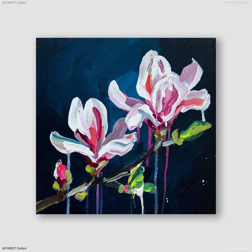 Origineel acrylverfschilderij op canvas, achteraan gesigneerd door Alice De Vliegher. Het werk maakt deel uit van de verfijnde Magnolia-reeks, die speciaal werd gecreëerd voor de expositie "Bloom" (2025).
