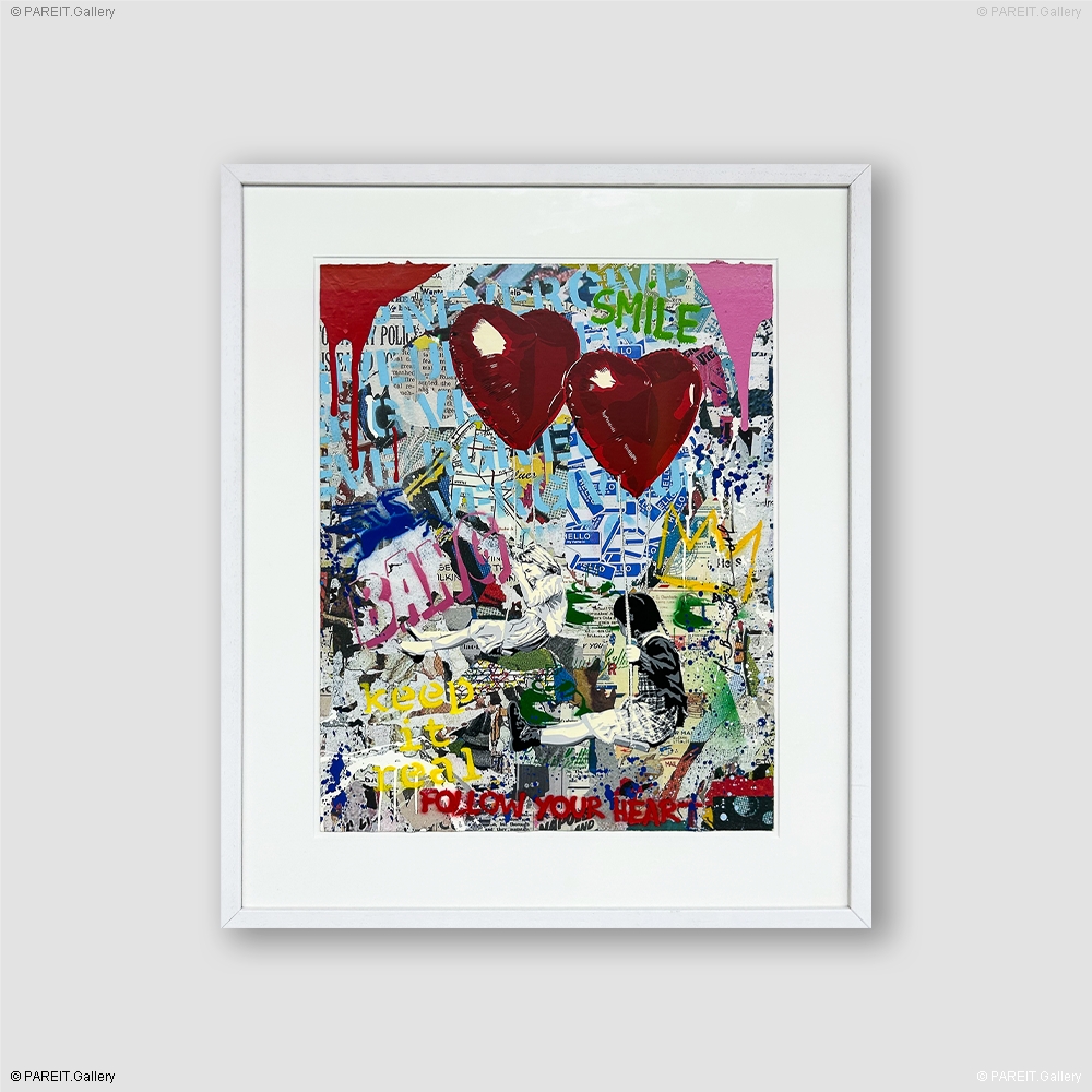Zeefdruk en gemengde technieken op papier. Dit werk is professioneel ingelijst in een witte kader met UV-werend glas - klaar om op te hangen en te bewonderen.