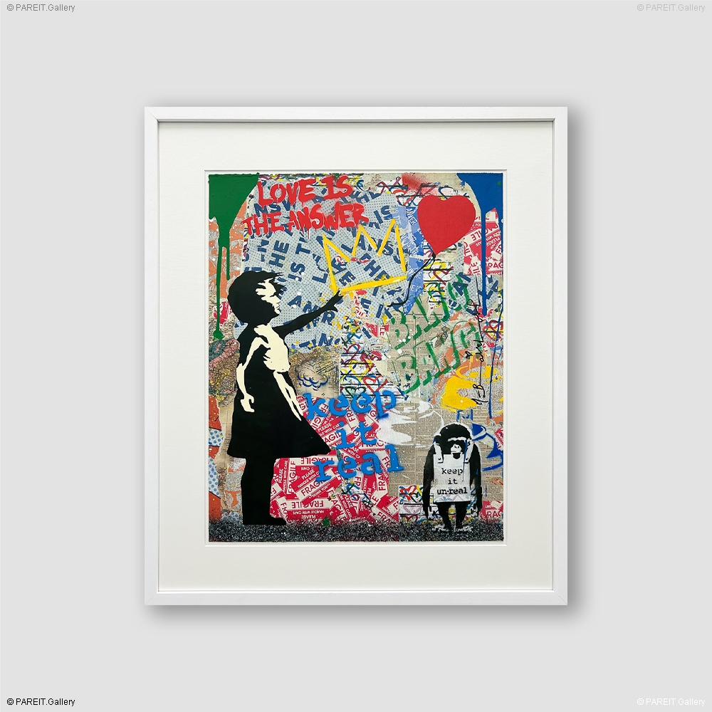 Zeefdruk en gemengde technieken op papier. Dit werk is professioneel ingelijst in een witte kader met UV-werend glas - klaar om op te hangen en te bewonderen.