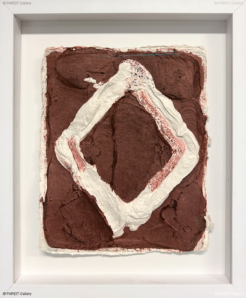 Werk (8/28) van Bram Bogart op papier. Een prachtstuk voor verzamelaars. Het werk is uitgevoerd in bruin-bordeaux en wit, een kleurcombinatie die uniek is binnen Bogarts oeuvre en slechts beperkt voorkomt. Het werk is professioneel ingelijst in een witte lijst en voorzien van ontspiegeld museumglas.