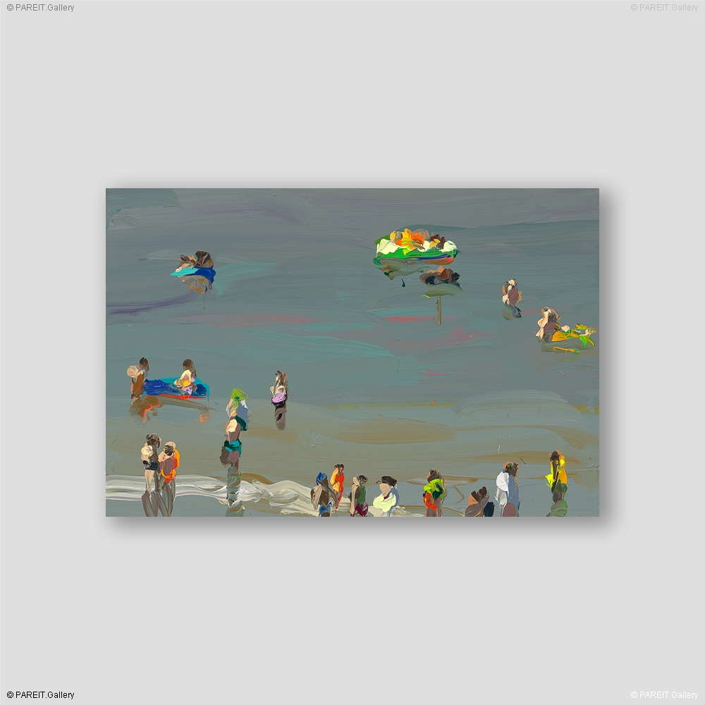 Sprekend strand-/zeezicht, uitgevoerd in (lagen) acrylverf op doek. Subtiele maar krachtige fluo-accenten brengen het tafereel tot leven en geven het een opvallende, dynamische uitstraling.