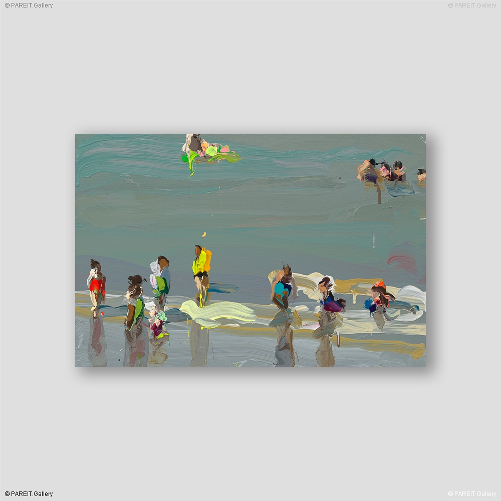 Sprekend strand-/zeezicht, uitgevoerd in (lagen) acrylverf op doek. Subtiele maar krachtige fluo-accenten brengen het tafereel tot leven en geven het een opvallende, dynamische uitstraling.