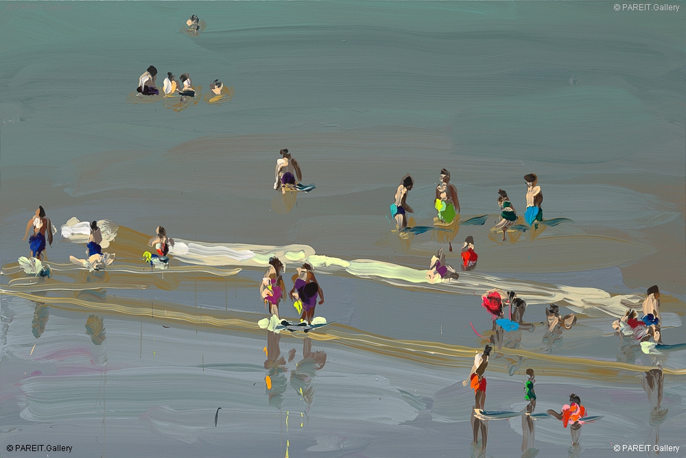 Een opvallend en recent element in deze reeks zijn de subtiele accenten in zelfontwikkelde fluoverf: kleine, maar krachtige ingrepen die de beelden doen oplichten en hen een onweerstaanbare levendigheid verlenen. "Neonkleuren hebben het vermogen om feller te gloeien dan wit", aldus de kunstenaar. Vooral in de lichte zomerkledij van de badgasten zorgt dat effect voor een intense visuele spanning: het oog blijft als het ware haken aan de felheid. De contrasten worden verscherpt, en de lichtste zones lijken haast letterlijk te stralen. De "Beach"-reeks verenigt zo technische virtuositeit met een zomerse, herkenbare energie die blijft fascineren.