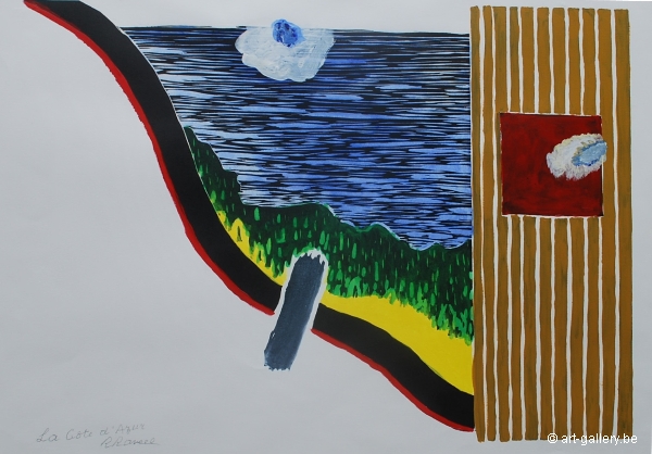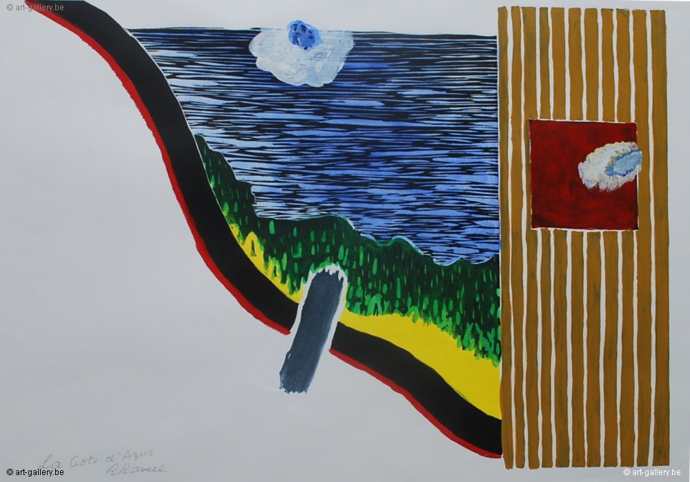 Extra info: Originele gouache van Roger Raveel. De azurenkust, in de visie van Raveel tot een essentie van kleur en lijn herleid. - Het werk werd professioneel ingelijst met museumglas. Dit werk is het originele ontwerp van de latere zeefdruk. Het werk is gemaakt met olieverf en aquarel geschilderd op papier.